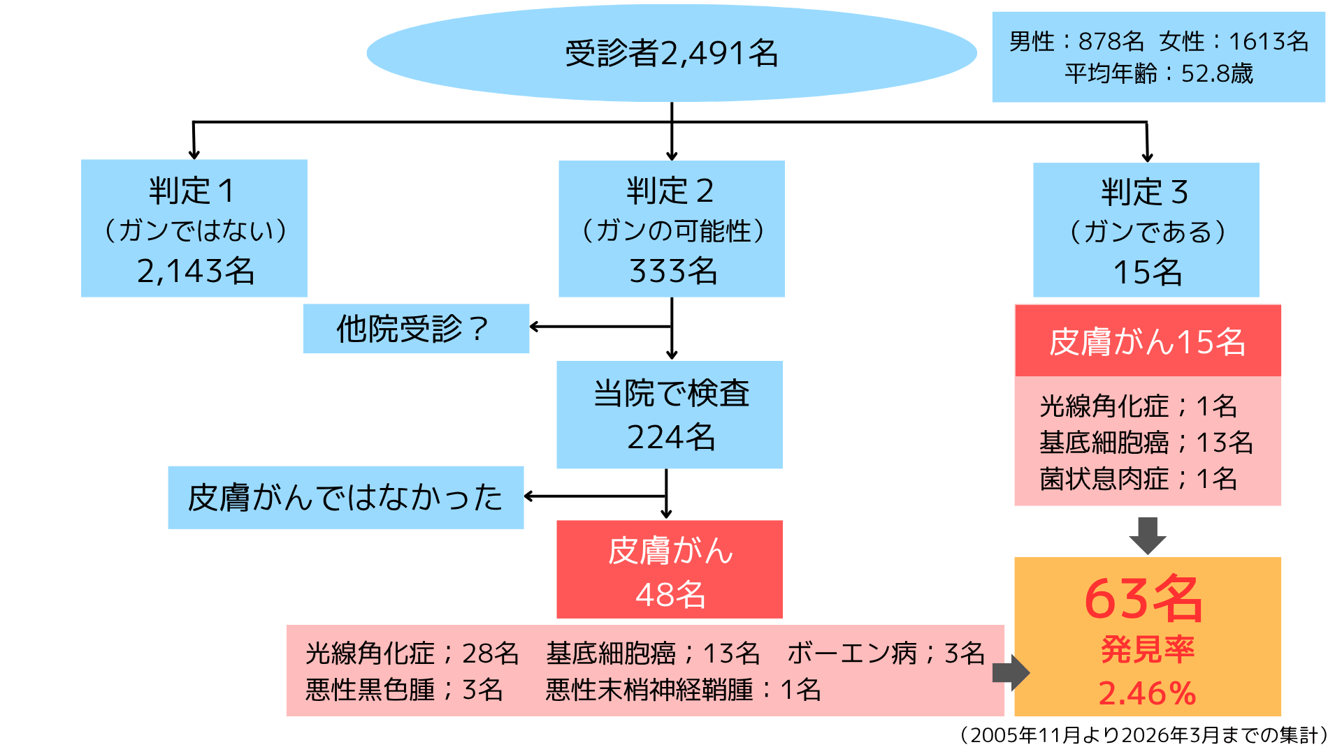 最終的に2,491名の受診者から63名(2.46%)の皮膚がんを発見できました。
